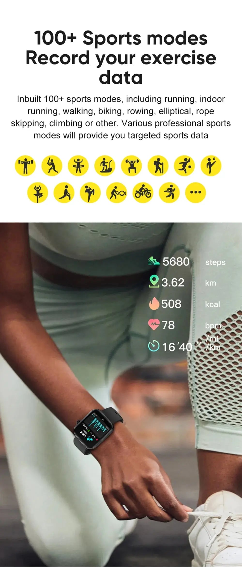 Activity Record( Steps, calories, distance), Sport Goal, 100+ Exercise Modes, Sports Data Report, IP68 waterproof.